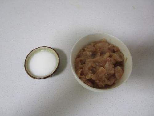 准备水淀粉,猪肉丝用生粉、1克盐10毫升料酒抓匀腌制半小时