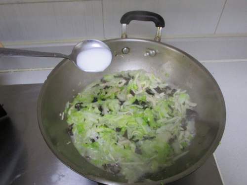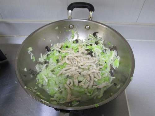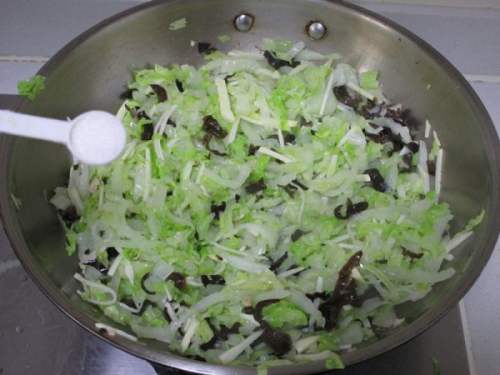 8再把白菜丝,冬笋丝和黑木耳丝倒入煸炒出香味加入盐
