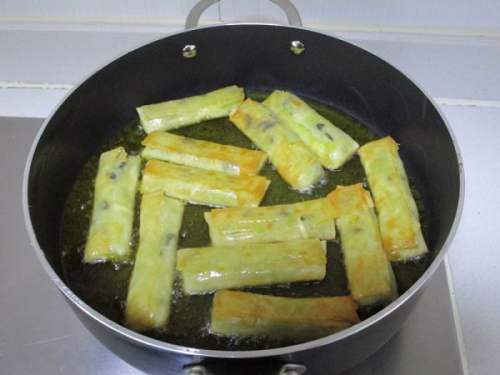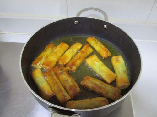 14锅内倒油温油把春卷加入煎至微黄后捞起