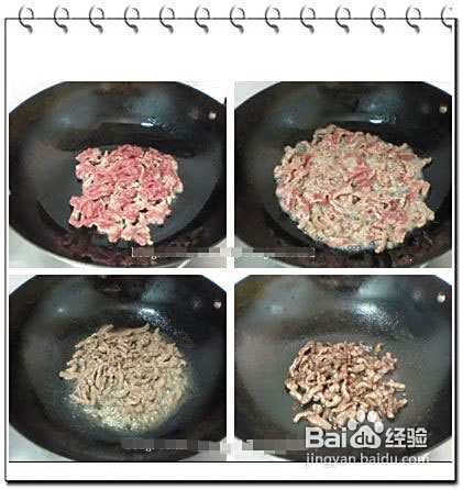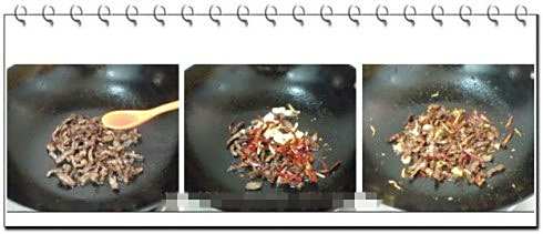 热锅放油,放入花椒,炸出香味后下入牛肉丝炒散后继续煸炒,要一直将水分炒干;