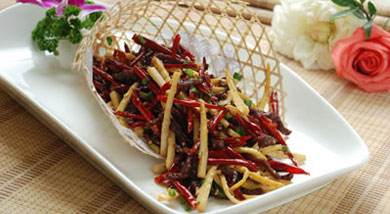 1、牛肉要做到酥香脆嫩、入口化渣,第一关看的是刀功。烹饪业内本来有“顶切牛羊顺切猪、直斩鸡肉斜片鱼”的行话,这是因为不同的动物肌肉,纤维结构和纤维质地不同的缘故。但是做干煸牛肉丝却不能墨守着行话业语的成规,你必须把牛肉的纹路斜过来切。你要是顺着牛肉的纹路去切,肌纤维太长,那炒出来不是牛肉,是“铜丝”;你要是按行话规矩把牛肉横过来切,肌纤维太短,干煸出来就成了牛肉渣。另外,干煸牛肉丝千万别上浆。做干煸牛肉丝,恰恰不能给原料上浆。你只要耐着性子把它切好就行了。