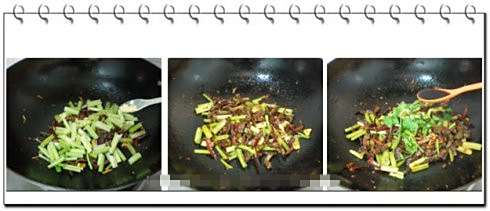 2、所谓干煸实际上就是“炕”,也就是用“少量的油”,在三四成热的油锅中,用文火慢慢地把牛肉丝中的水分逼出去。油要是太多了,那就成了炸,油温高了会把牛肉炸焦,油温低了会把牛肉炸软。你说“要是我油温刚好呢?”对不起,那会把牛肉炸干了的。总之,千万别在这个问题上发“牛脾气”,油要是放多了,就算你是个厨神,也不能把牛肉丝做出酥爽的口感来。 那到底该放多少油才算是所谓的“少量的油”呢?很简单,油比肉丝略少一点就可以了,这点油刚好够把肉丝划散,油再少,牛肉丝就粘锅了。