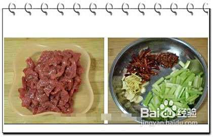 将牛肉洗净沥干,斜切成丝;香芹剪去根与叶子后洗净,切成约3厘米长的段;干辣椒洗净后用剪刀将其竖向剪开,去籽后再剪成条;生姜切丝,大蒜去皮切片,郫县豆瓣剁碎,香菜洗净切成段;