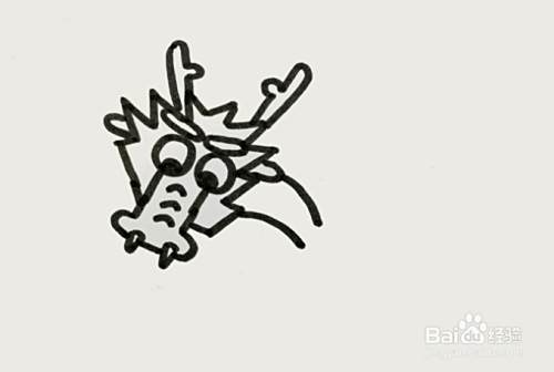 先在纸上画出龙头,画出两个大眼睛和长长的嘴巴以及獠牙,还有头上一对长长的龙角。