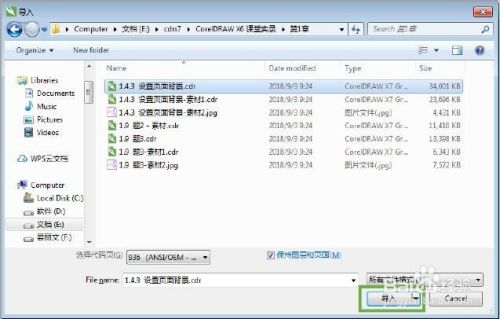 1.利用菜单命令:选择“文件”>“导入”选项,打开“导入”对话框,在其中选择要导入的文件,单击“导入”按钮,此时“导入”对话框关闭,将光标移至页面中,按下鼠标左键并拖动绘制矩形区域,以确定导入文件在页面中显示的尺寸,释放鼠标后,文件就被导入到页面中。若直接在页面中单击,可将文件以原始尺寸导入。