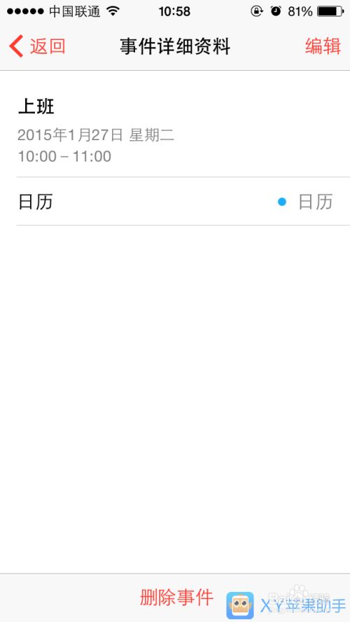 智能手机已经成为了人们日常生活不可缺少的一部分,许多之前需要通过别的工具来完成的工作现在只需要一台iPhone就可以高枕无忧了,日历就是其中之一。XY苹果助手小编记得小时候经常看到爸爸妈妈在日历上画圈写字记录日志和事件,现在在iPhone日历中,也可以记录事件,还具有提醒功能。具体操作方法如下: