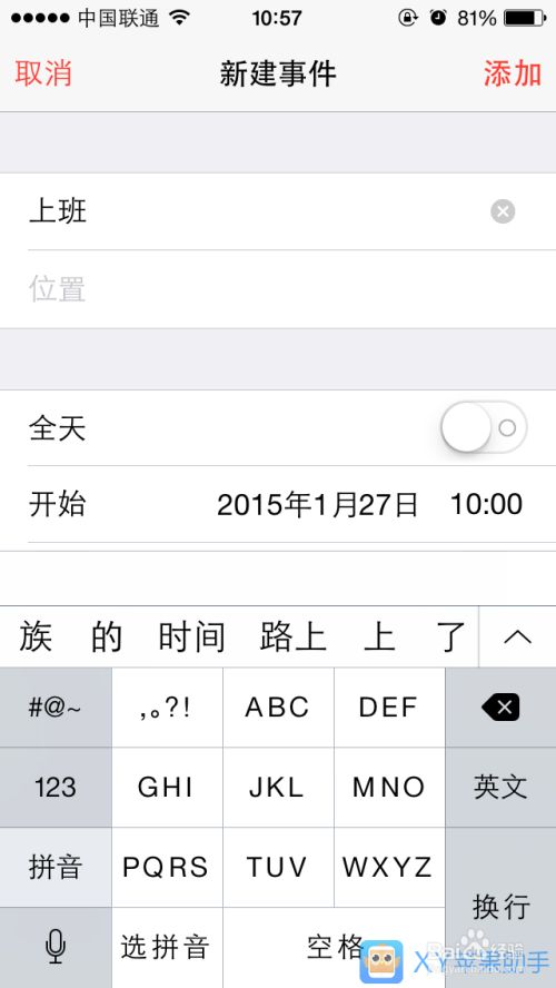 在“添加事件”页面,输入标题、位置,指定时间,设置提醒等后,点击“添加”。