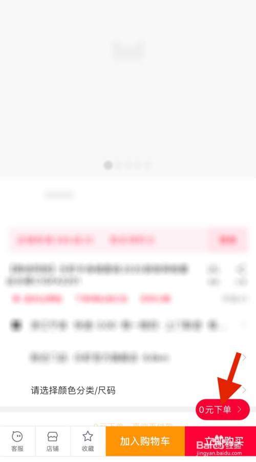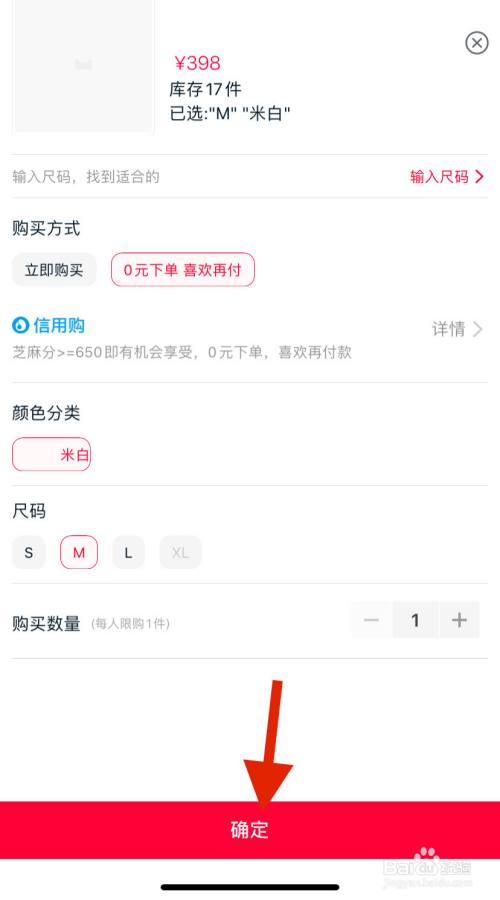 在弹出来的页面中,选择购买方式为“0元下单 喜欢再付”后再选择你要买的商品颜色以及尺码后点击“确定”。