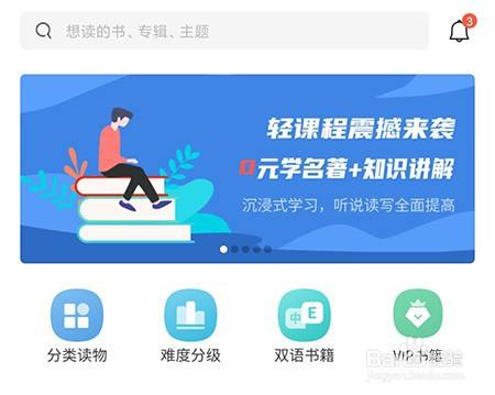 首先打开英语读书APP,进入书城页面,通过各种分类找到自己感兴趣的阅读资源;