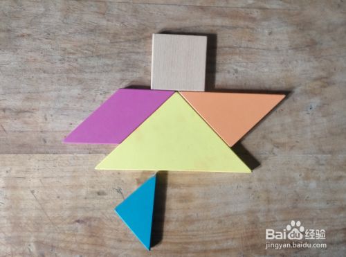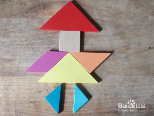 摆上余下的红色大三角形,放在正方形的上面挨着,直角向上,如图。童话里面的小红帽就拼组好了。