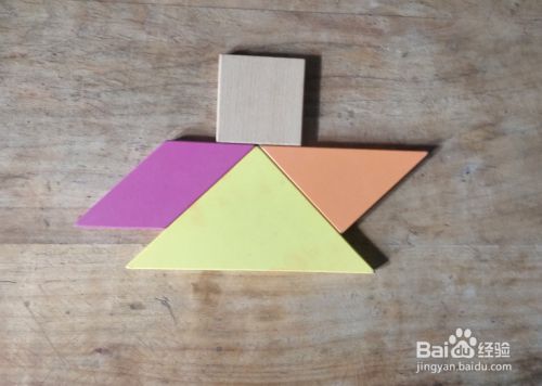摆上正方形,放在大三角形的上面挨着,靠中间,如图。