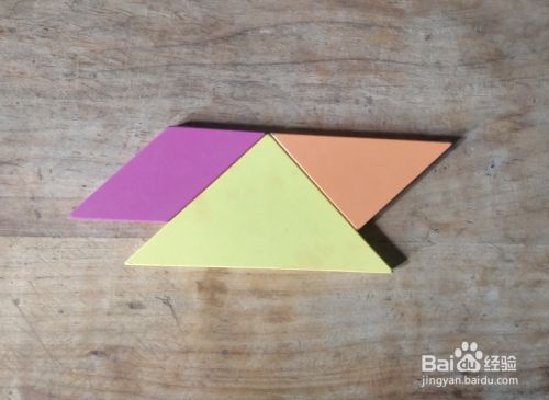 摆上余下的小三角形,放在小三角形的右侧,直角向右,如图。