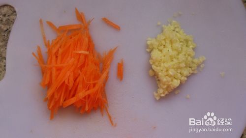 把白菜切成细条状,红萝卜切丝,蒜头剁成蒜蓉。