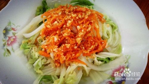萝卜丝和蒜蓉炒好后,直接倒在大白菜上面,并加点香油。美味的“萝卜丝拌白菜”就可以端上桌了。食用前,记得用筷子搅拌一下,更加入味。