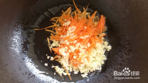 锅里倒入适量食用油,把红萝卜丝、蒜蓉倒入锅里翻炒两分钟左右,并加入盐、鸡精等调料。(喜欢吃辣的朋友,可以放点辣椒。)