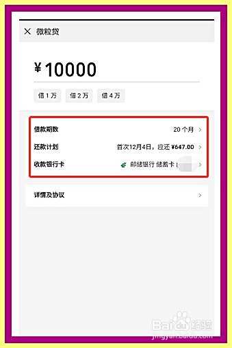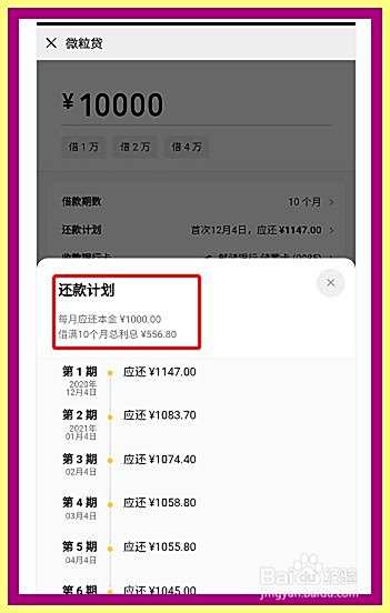 如图,点击【借钱】,接入借款界面,选择借款金额,借款期数,收款银行卡,通过该界面也可查看还款计划。