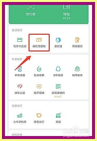 如图,此时点击【支付】功能进入支付界面,在该界面找到【微粒贷借钱】功能选项。