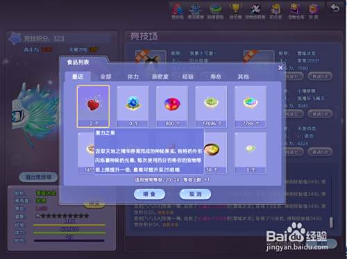 然后点潜力之果。然后喂食就可以看见宠物可以从20上升一级经验限制
