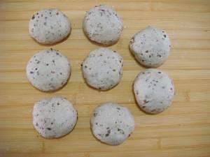 发酵好的面团,用手掌压出气体排气,将面团分成8等份,揉圆,盖上保鲜膜中间醒发15分钟。