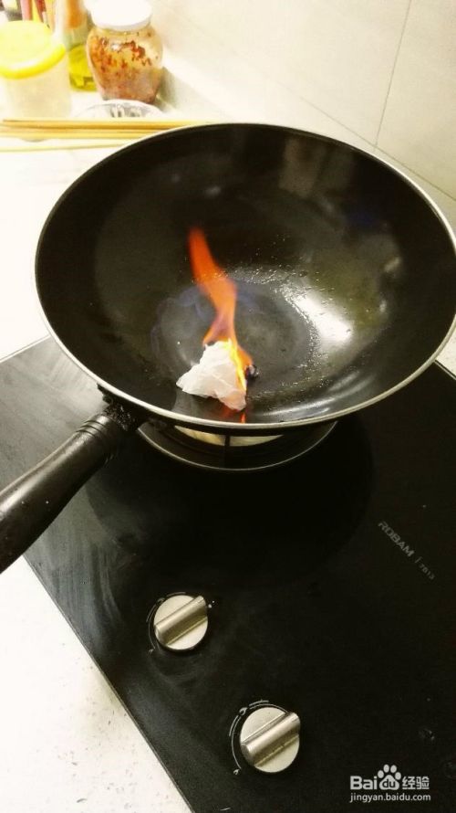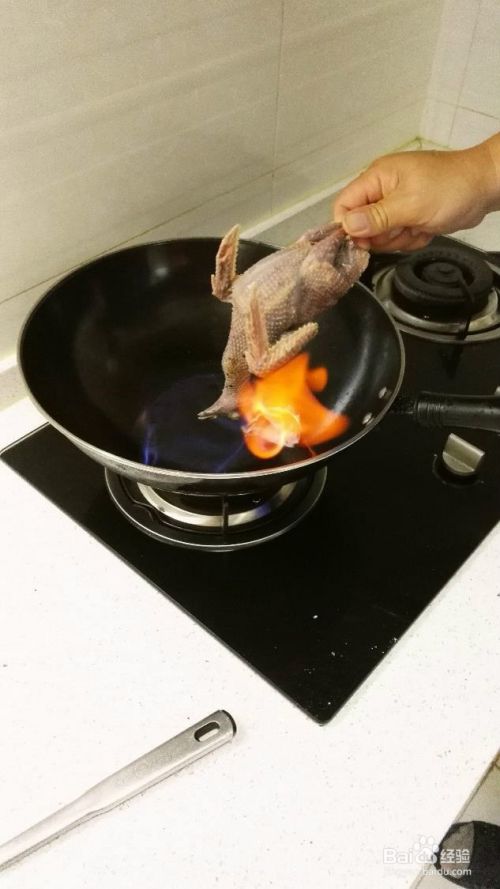 在锅中倒入少许酒精,将餐巾纸点燃让入锅中,酒精着燃烧了。这种火用于将鸽子上的杂毛烧没。烧后洗净。