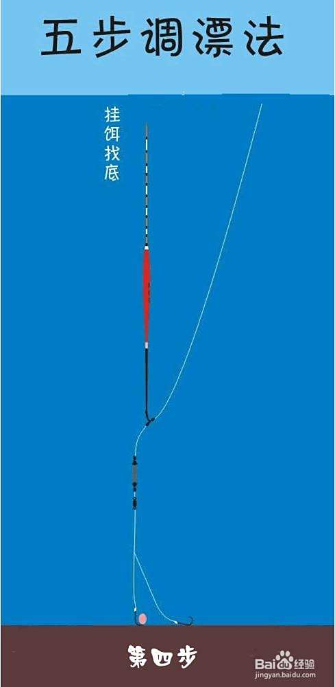 调漂第四步:挂上与垂钓时大小质重相近的饵团找底。这里挂一粒也挂两粒都没有太多关系了,但是如果挂一粒的话,最好是挂上钩,才能准确找底。