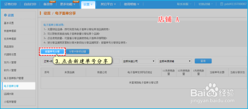 打开A店铺,点击设置>>>>>电子面单分享,点击新建单号分享;