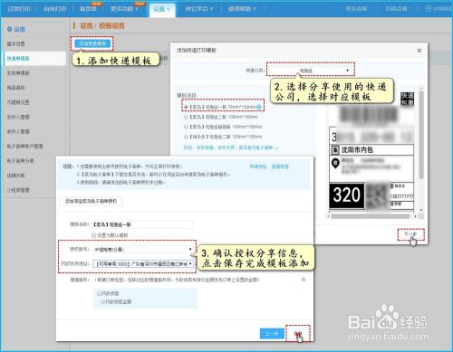 返回B店铺,设置>>>>>添加快递模板,选择分享好的账号,完成电子面单模板添加。