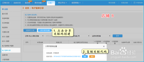 打开B店铺的电子面单分享页(设置>>>>>电子面单分享),点击分享关联码创建,复制B 店铺的关联码;