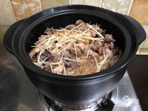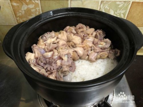 在水慢慢开始发干,但还不是全干的状态下码入腌制好的鸡肉