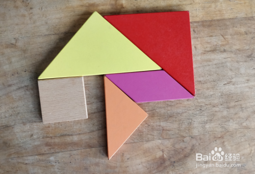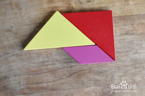 摆上余下的大三角形,放在平行四边形的右上挨着,直角在右侧上端,如图。
