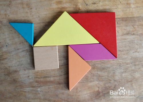 摆上余下的小三角形,放在左侧大三角形的左侧挨着,直角在右侧上端,如图。一头牛就拼组好了。