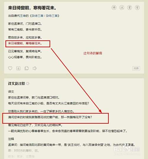 2.点击全诗欣赏,就可以看到,这句话的解释。如图所示。这句诗的意思就是:请问您来的时候我家雕画花纹的窗户前,那一株腊梅花开了没有?