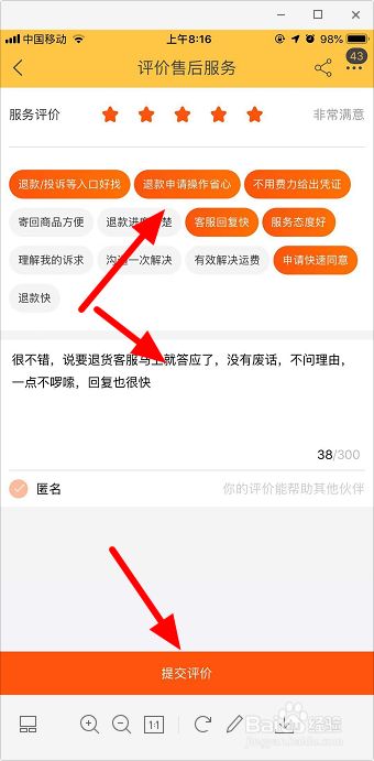 选择评价理由,比如【退款申请操作省心】等,然后输入具体的评价内容,点击下方的【提交评价】。