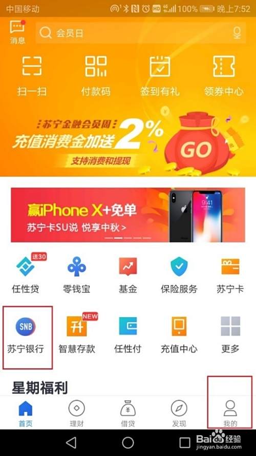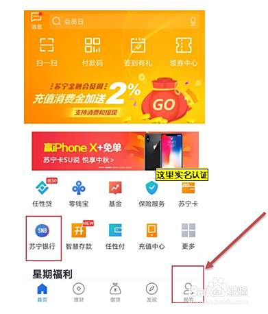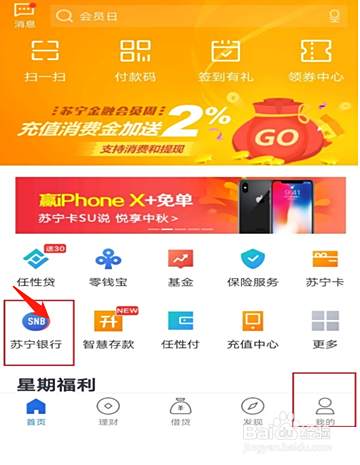 回到首页,点击左中下角苏宁银行