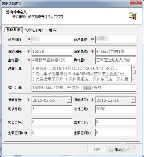 活动的说明:可填写活动的“使用说明文字”和“备注信息”,给客户使用指引,也方便事后统计;