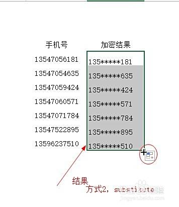 本次使用的公式:SUBSTITUTE(E6,MID(E6,4,5),"*****"),表示,先用mid截取手机号的第四位到第8位的数据,再将这个数据段用substitute函数替换成*号。