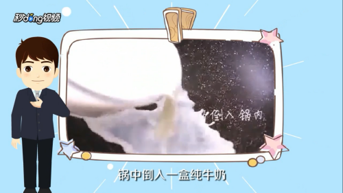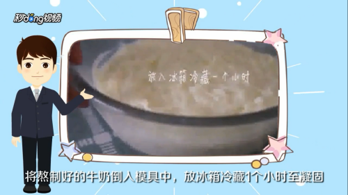 将熬制好的牛奶倒入模具,放冰箱冷藏1个小时至凝固。