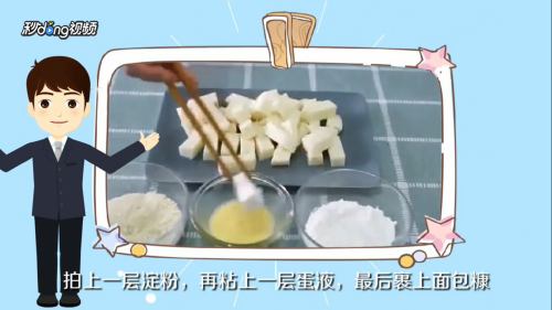 凝固后,取出切成方条,拍上一层淀粉,粘上一层蛋液,裹上面包糠。