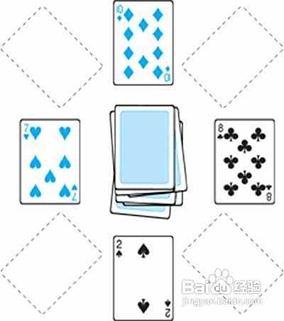 4玩法:为每位玩家发七张牌,然后将四张牌翻开作为补充牌堆。(每张K都要放入下图所示的每个角落区域。)将剩下的牌正面向下放在中央,作为抽牌堆。