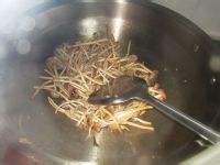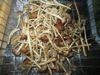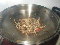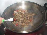 将茶树菇倒入炸制3分钟左右,盛出备用。