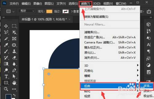 第三步,鼠标选中矩形,点击滤镜菜单中的波浪扭曲按钮;