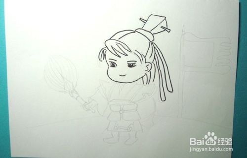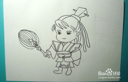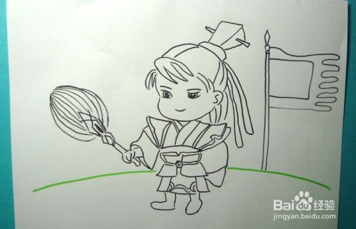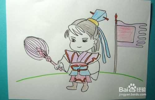 最后,用红色和紫色彩铅笔给旗帜涂上颜色,并用红色彩色笔给扇子涂上颜色,这样冷静的贾诩的画就画好了,如下图所示。大家按照步骤也来画画吧。