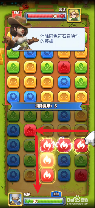然后在游戏开始界面根据新手引导开始消除5个红色的方块,接着再消除其他同颜色的方块;