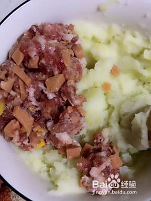 再加入土豆泥搅拌均匀(我掺了一点香肠)