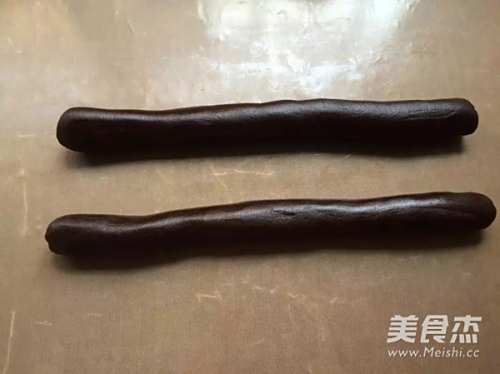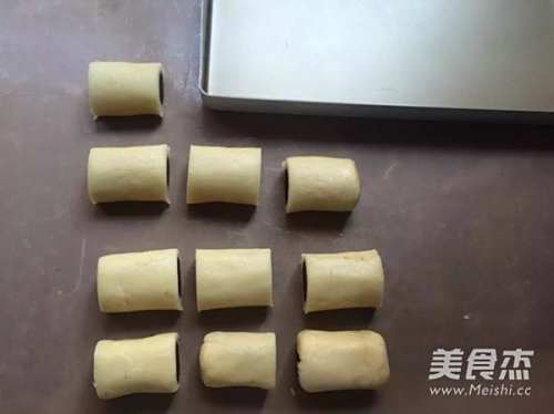 11包裹好后的成长圆柱型,可以分割成两段,稍稍揉圆。