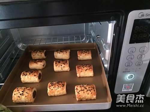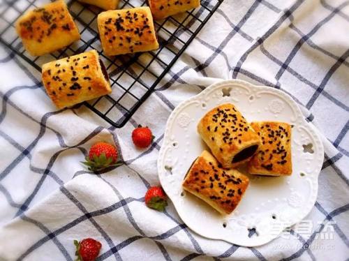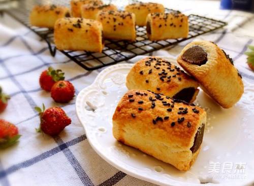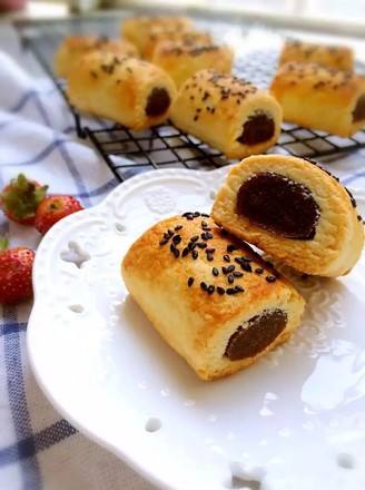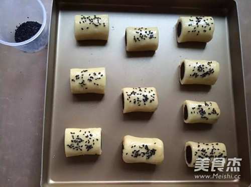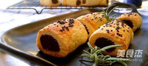 9面团拿出来擀开,如图擀成长条型,放入豆沙馅料条。
