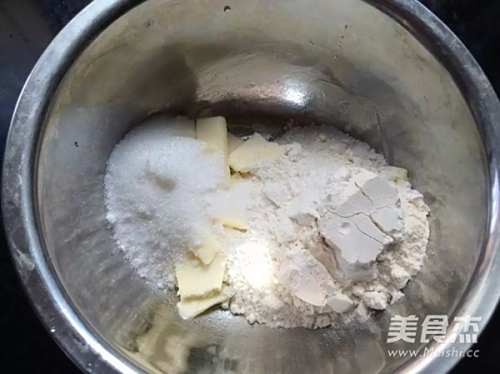 3把细砂糖拌入黄油,稍稍拌匀。再加入面粉里。