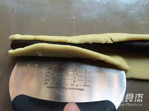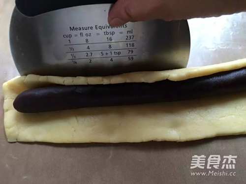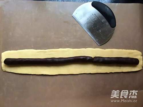 10面团在刮刀的辅助下,包裹住豆沙馅料条。