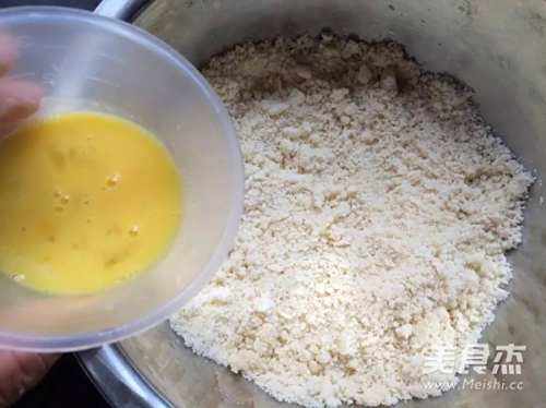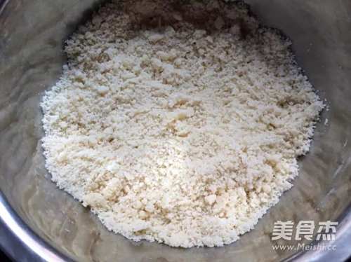 4净手后,捻碎黄油,把面粉揉和在一起,搓匀后的面粉像粗玉米粉的状态。