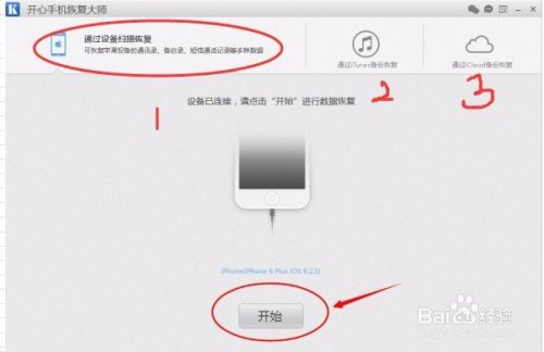 将手机或设备连接到你的电脑,运行开心手机恢复大师软件,此时会跳出首页界面,选择第一模式,直接点击开始按钮,进入恢复界面。